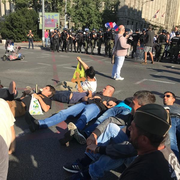 16.05 - Na ulasku u Bulevar Kralja Aleksandra okupila se grupa ljudi, protivnika Prajd šetnje. Leže na ulici drže se za ruke i pevaju verske pesme - Božićni tropar i pesme o Isusu.
