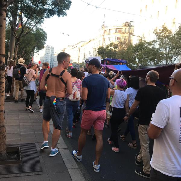 17.00 - Prajd šetnja je počela. Svi su veseli, đuskaju. Muškarci su posebno za ovu priliku obukli štikle.