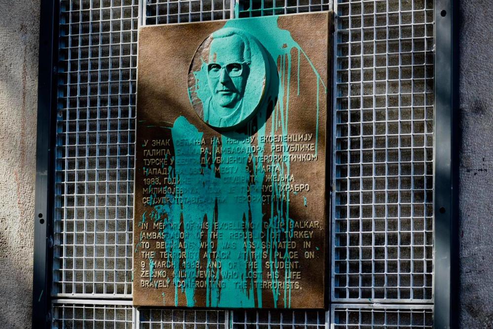 Nažalost, za sada nepoznati izgrednici, oskrnavili su spomen-ploču prosuvši zelenu forbu direktno po ploči i liku ubijenog ambasadora!