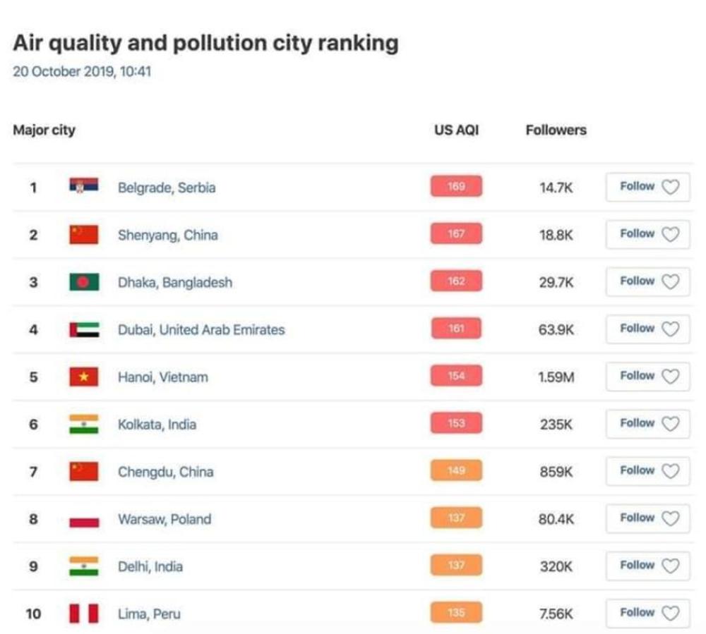 Iako je u svetu mali Beograd zauzeo visoku poziciju ušavši u prvih deset na listi koja govori o ugroženosti zdravlja stanovnika i mogućim zdravstvenim komplikacijama, situacija je juče bila još alarmantija. Prema dostupnim podacima, Beograd se 20. oktobra našao na samom vrhu liste gradova sa zagađenim vazduhom - u crvenoj zoni sa zagađenošću od 169 jedinica.
