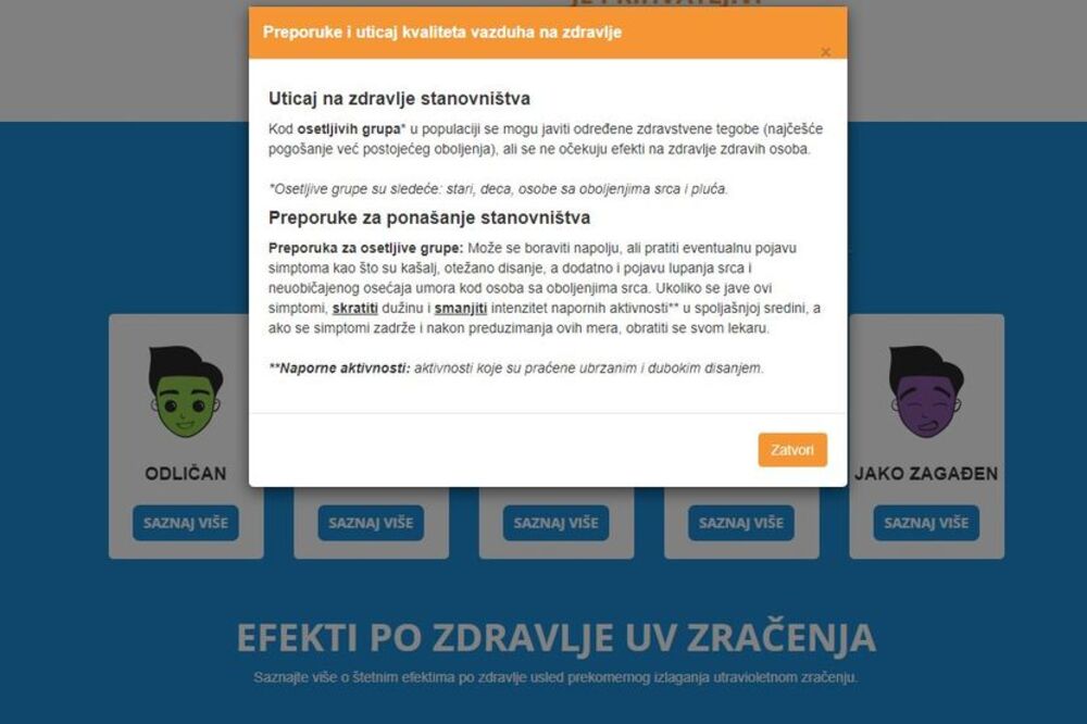 Šoštarić ističe da je kvalitet vazduha u velikim gradovima svakako lošiji, ali da ovoga puta nema mesta panici. Iako je i tokom današnjeg dana, kao i jučerašnjeg na sajtu Beoeko zagađenost obeležena narandžastom bojom (središnjom opcijom od pet - zelena označava odličan kvalitet vazduha, žuta dobar, narandžasta prihvatljiv, crvena zagađen i ljubičasta jako zagađen), tvrdi da ni u slučaju petog stepena zagađenja vazduha nema rizika od akutnih zdravstvenih problema.