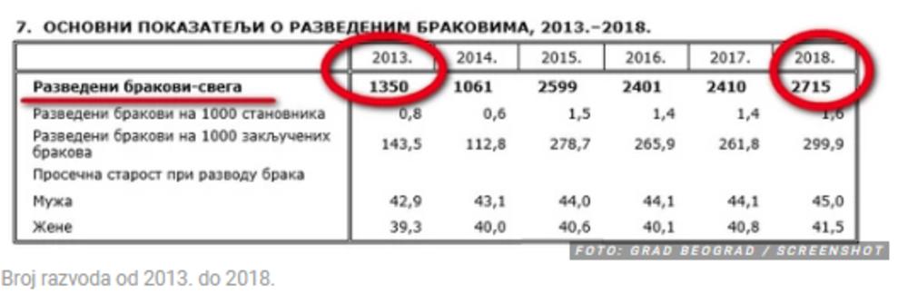 Tako je, ukupno, na teritoriji Beograda protekle 2018. godine zaključeno 9.053 braka, dok je razvedenih bilo 2.715. Podatak koji nikako ne bi trebalo zanemariti jeste da se broj razvedenih brakova od 2013. godine, kada ih je bilo 1.350, do protekle 2018. godine duplirao (2.715)!