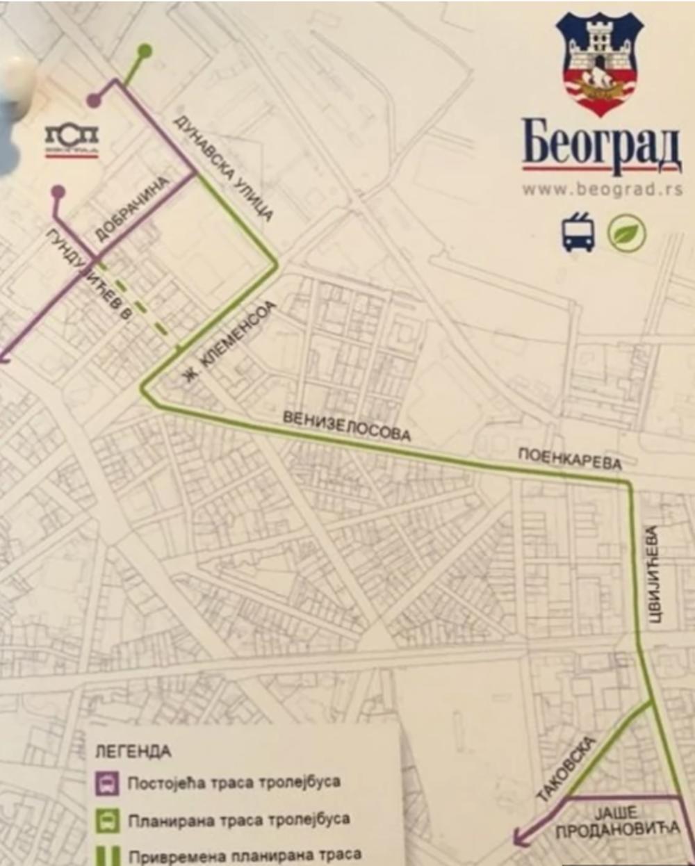 Trolejbusi kao najekonomičniji gradski prevoz sa najmanjom bukom i nultom emisijom štetnih gasova, prolaziće od pogona GSP "Beograd" ulicama Dobračina, Dunavska, Žorža Klemansoa, Venizelosova, Poenkareova, Cvijićevom do postojećih linija u Takovskoj, Jaše Prodanovića i nastavku Cvijićeve. Ulicom Gundulićev venac planirana je privremena trasa do izgradnje terminusa u Dunavskoj ulici", stoji u obaveštenju.
