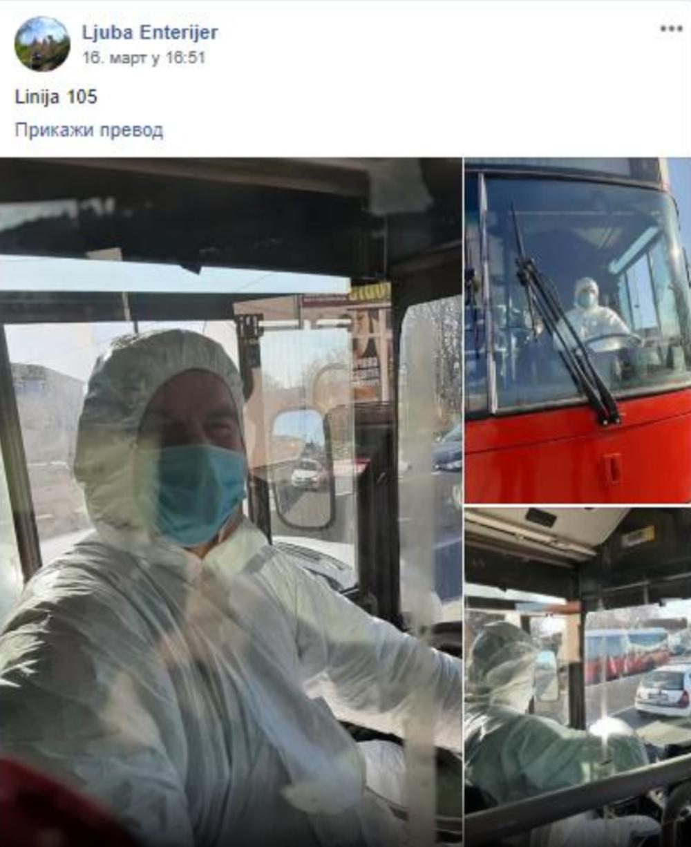 Vozaču sa linije 105 koja koja saobraća do Ovče video se samo gornji deo lica. On je nosio i rukavice, pa se slobodno može reći da se na pravilan način zaštitio od korona virusa.