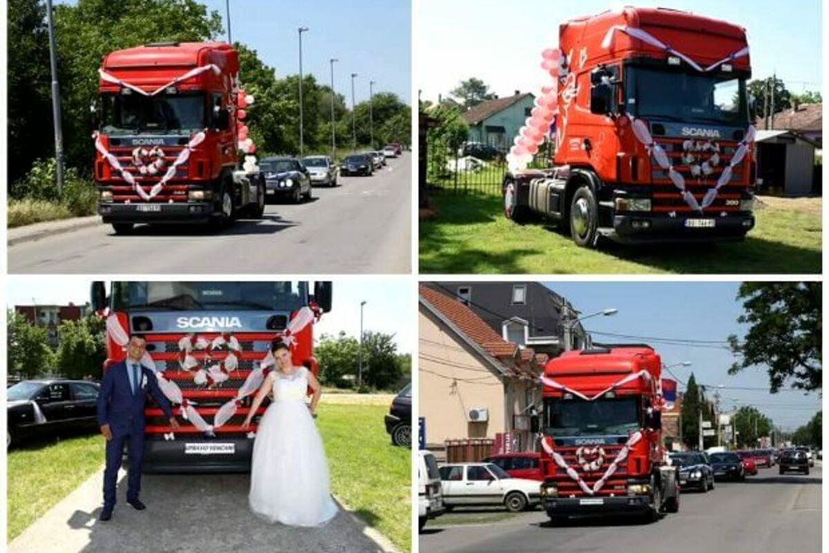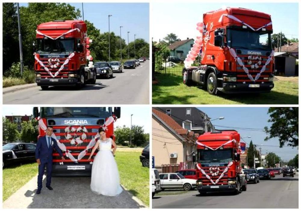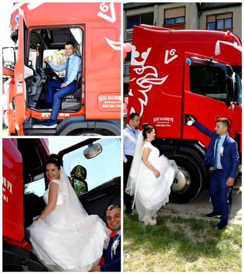 Većina mladenaca prilikom odabira za mladenačko vozilo traži najbolji auto kod prijatelja ili rodbine.Što ste povraćali po autobusu, povraćali ste! Sada je to strogo zabranjeno! (FOTO)iznajmljuju luksuzne automobile ili limuzine,uživali u tom predivnom danu ali i privukli pažnju gde god svatovi krenu.Aleksandra i Aleksandar su za svoj najlepši dankamion – šleper crvene boje.foto: Leva obala Beograda InfoSvatovi su, krenuli iz Padinske Skele,mladoženja, po mladu do Besnog Foka,do crkve u Padinskoj Skeli i onda do Mesne zajednice u Borči.foto: Leva obala Beograda InfoMladoženja je kamion pozajmio od svog kuma, sam ga je okitio, ali i vozio.Lobi-info