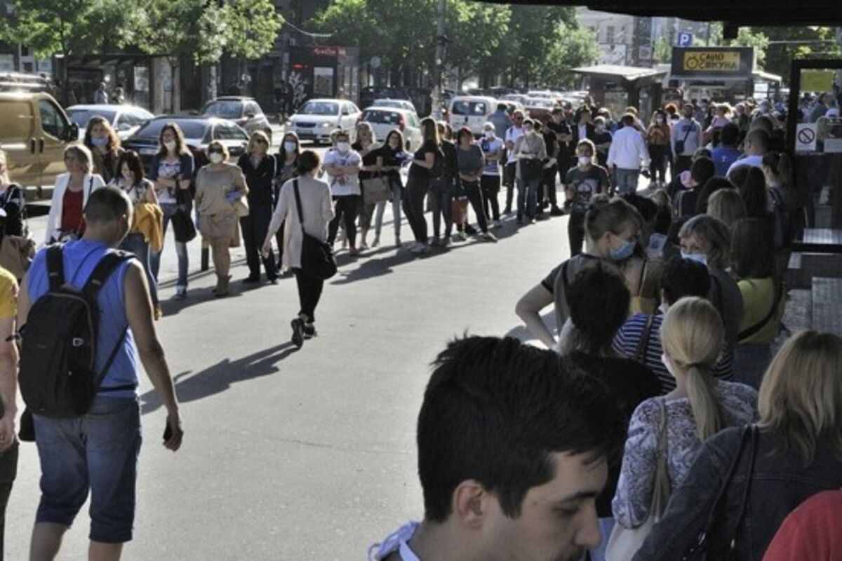 Ljudi stoje u koloni, poštujući preporuke Vlade Republike Srbije o razmaku i upotrebi zaštitnih maski