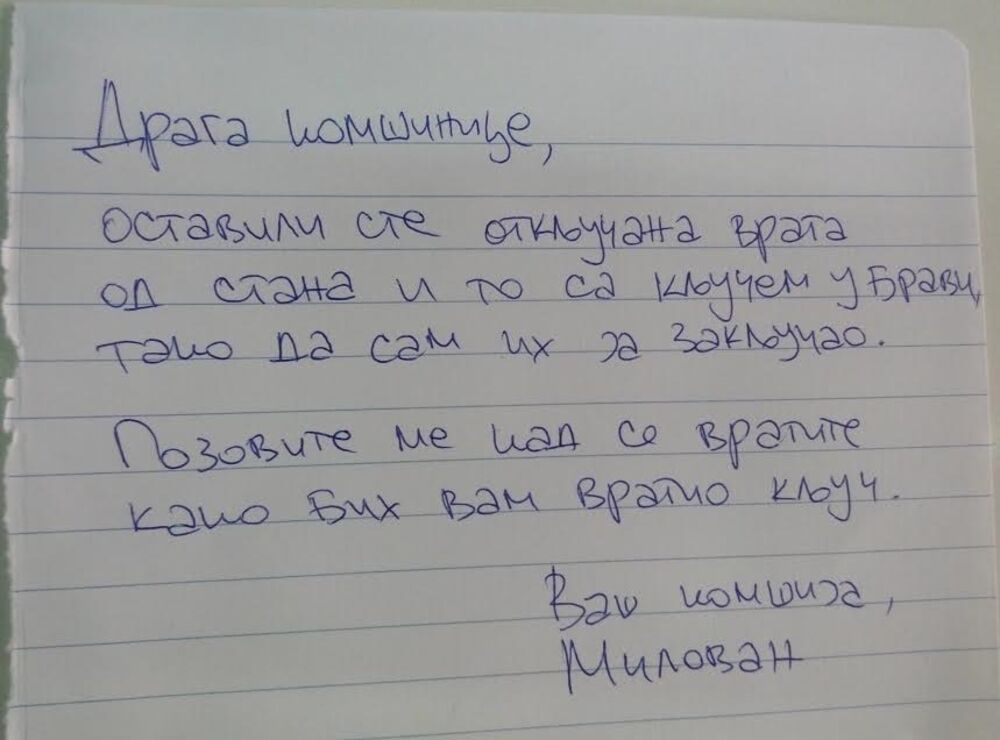 Jedna Beograđanka našla je ovu poruku ispred vrata svog stana... Eh da je takvih ljudi više...