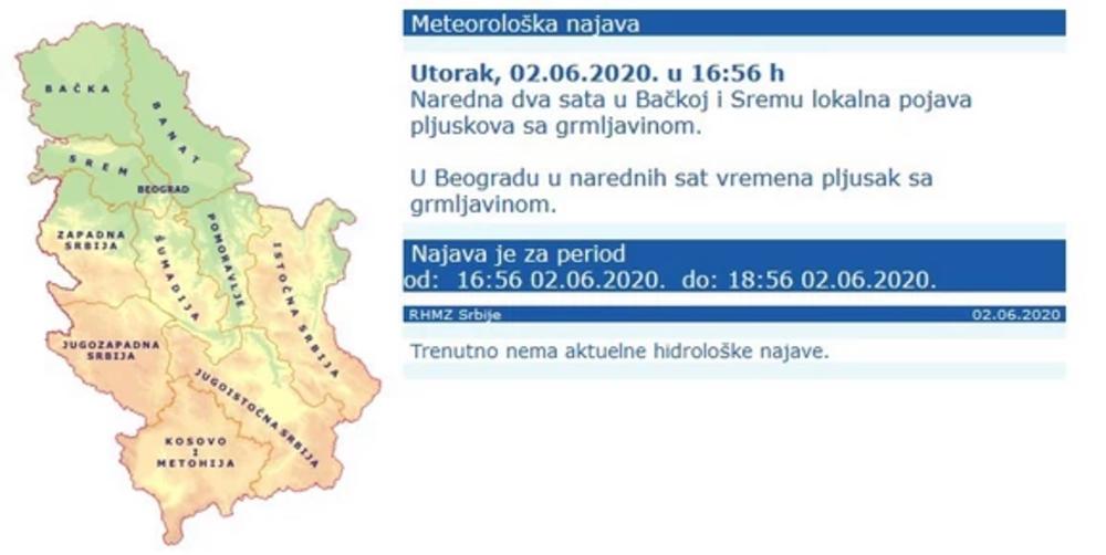 "Naredna dva sata u Bačkoj i Sremu lokalna pojava plјuskova sa grmlјavinom. U Beogradu u narednih sat vremena plјusak sa grmlјavinom", stoji u najnovijoj najavi Republičkog hidrometeorološkog zavoda (RHMZ).