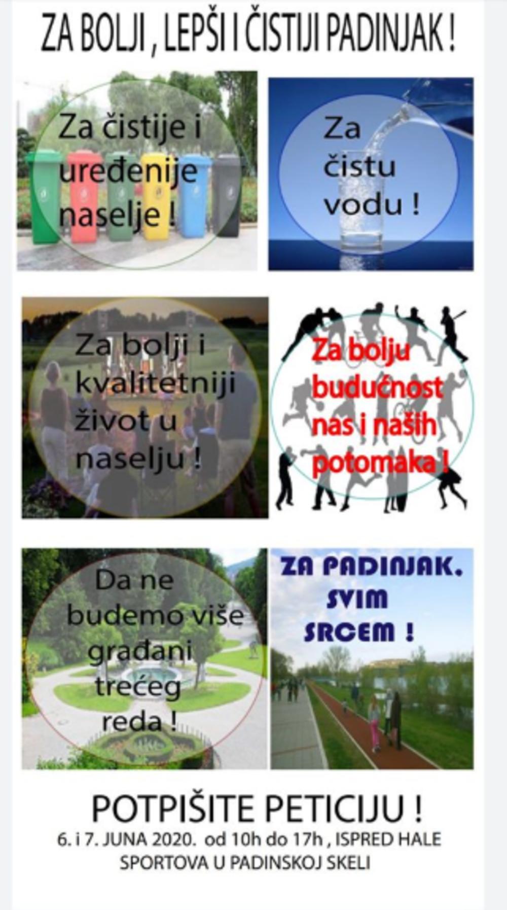Potpisivanje ove peticije biće moguće u subotu i nedelju, 06. i 07. juna, od 10.00 do 17.00 časova, ispred sportske hale u Padinskoj Skeli.
