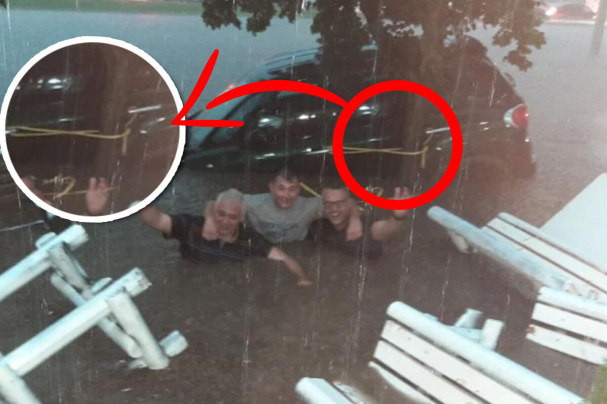 Naime, na njemu se vidi kako su tri dosetljiva muškarca sa fotografije vezala nekim žutim užetom automobil kako ga ne bi odnela voda.