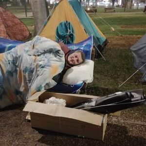 Čovek leži pored žardinjere, a nadomak njegove glave se može zapaziti limenka.