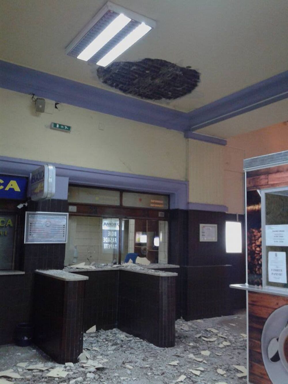 Naime, deo plafona pao je, i to na deo gde građani prilaze da se raspituju za polazak i dolazak vozova, tj. ispred info šaltera.