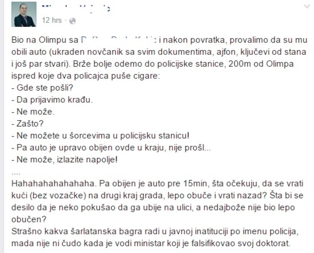 "Bio na Olimpu sa drugom, i nakon povratka, provalimo da su mu obili auto (ukraden novčanik sa svim dokumentima, ajfon, ključevi od stana i još par stvari). Brže bolje odemo do policijske stanice, 200m od Olimpa ispred koje dva policajca puše cigare: