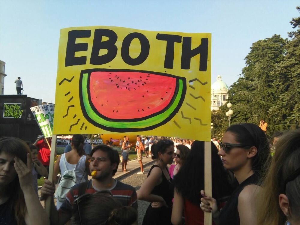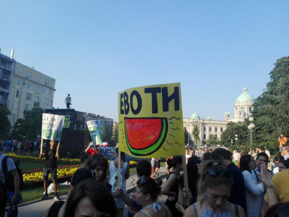 18.28 - Tu je poznati simbol protesta "patkica". Okupljeni građani nose tranparente ("Pašce mali a pašce i veliki", "Ostvke su must have", "Beograd nije Mali"...) i uzvikuju poznate parole: "Naš grad", "Neće proći", kao i "Državna mafija".