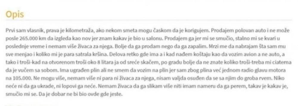 "Prvi sam vlasnik, prava je kilometraža, ako nekom smeta mogu časkom da je korigujem. Prodajem polovan auto i ne može posle 265.000 km da izgleda kao nov, jer znam kakav je bio u salonu. Prodajem ga jer mi se smučio, stalno mi se kvari u poslednje vreme i nemam više živaca za njega. Bolje da ga prodam nego da ga zapalim. Mrzi me da nabrajam šta sam mu sve menjao i koliko mi je para satrala kršina", kaže on u uvodnom delu oglasa.