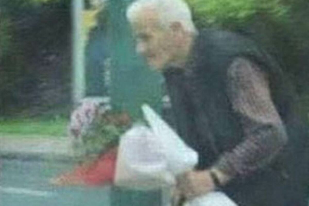 On je uslikan kako pogrbljen prelazi šine, a dok u jednoj ruci nosi kišobran uz pomoć kojeg se oslanja dok hoda, u drugoj je brižno upakovan buket cveća.