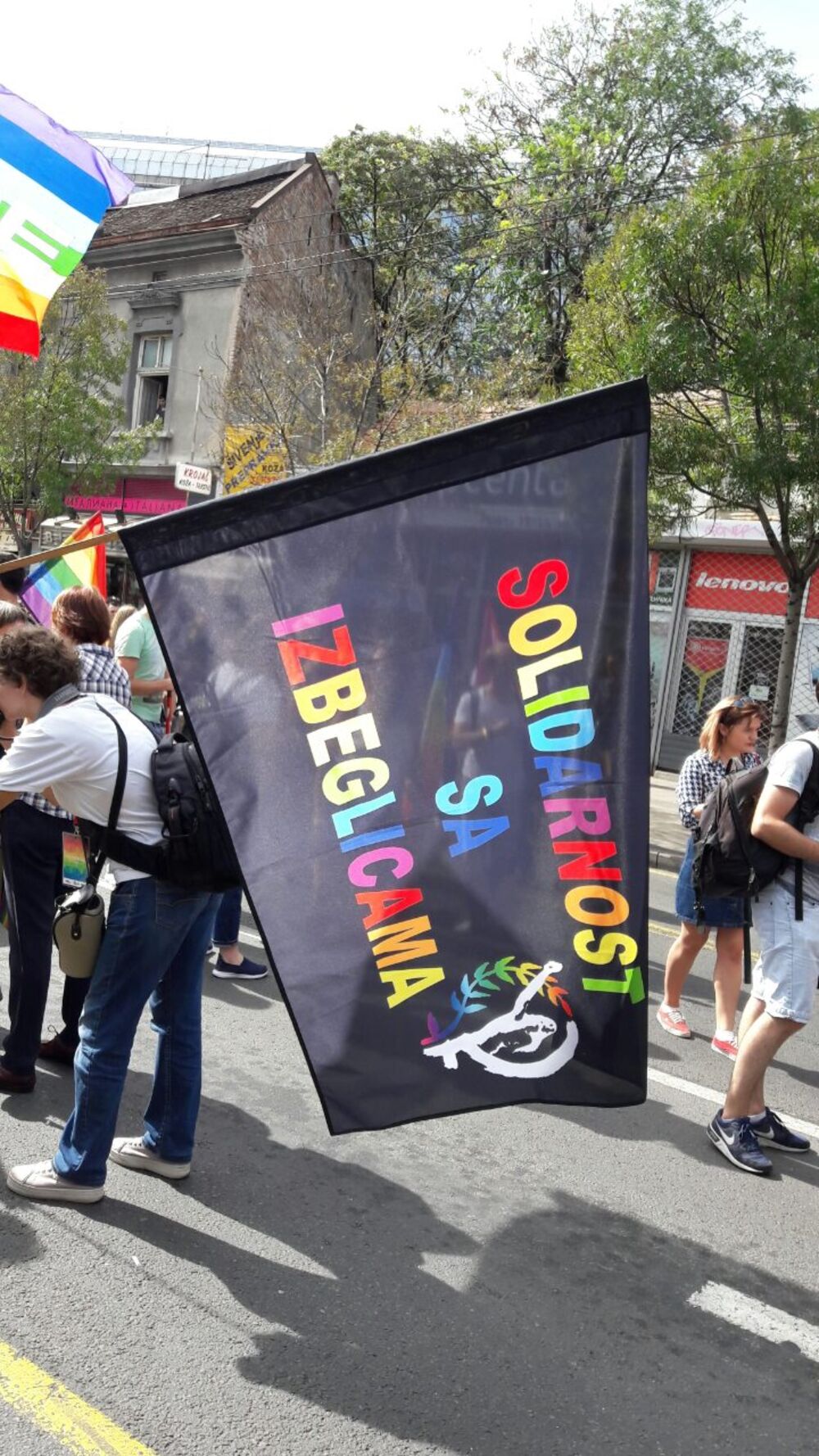 Ona je prepoznatljiva po transparentu koji nosi, a na kom piše "Podrška izbeglicama".