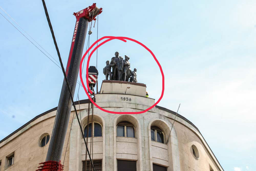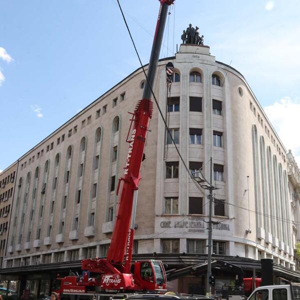 Beograđani su danas u čudu posmatrali scenu na uglu Terazija i Trga Nikole Pašića: kamion, kraj, i veliki spomenik na kojem su predstavljene 4 ljudske figure.