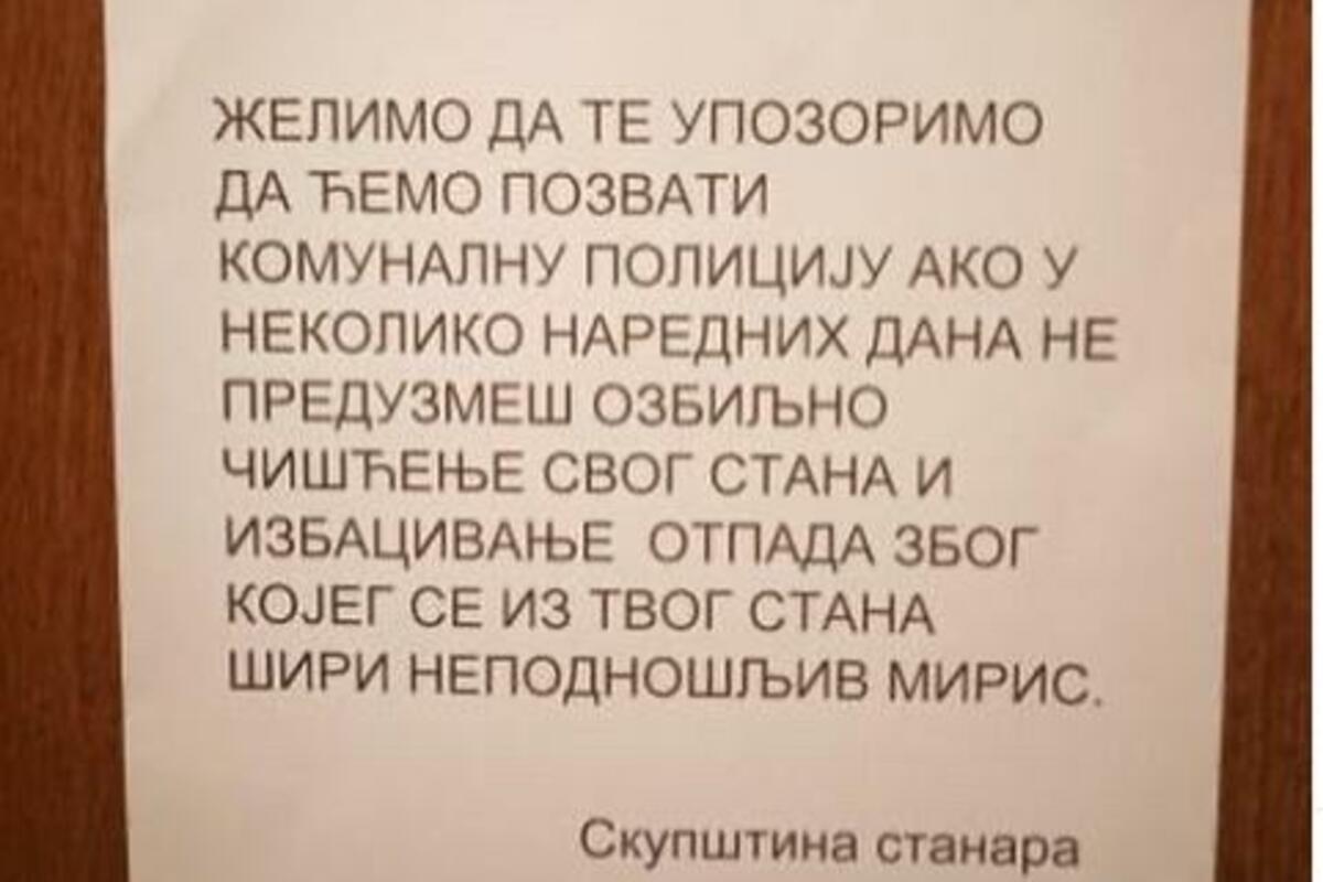 Stanari zgrade na Novom Beogradu nisu zadovoljni higijenom komšije. Svoje nezadovoljstvo objavili su javno, dajući do znanja stanaru da mu preti ozbiljna kazna ukoliko ne uradi nešto povodom smrada koji izbija iz dotičnog stana.