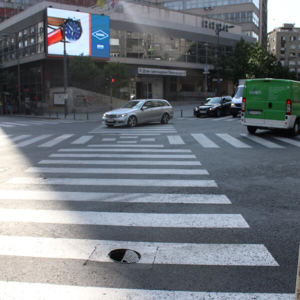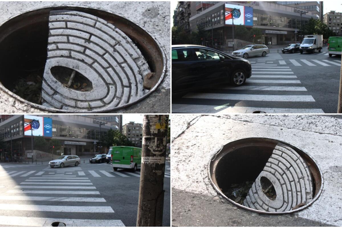 Na dijagonalnom pešačkom prelazu, na raskrsnici kod Doma omladine – na uglu Dečanske i Makedonske ulice pojavila se rupa, odnosno, poklopac šahta je propao u njega, kao što možete da vidite na fotografijama sa lica mesta!