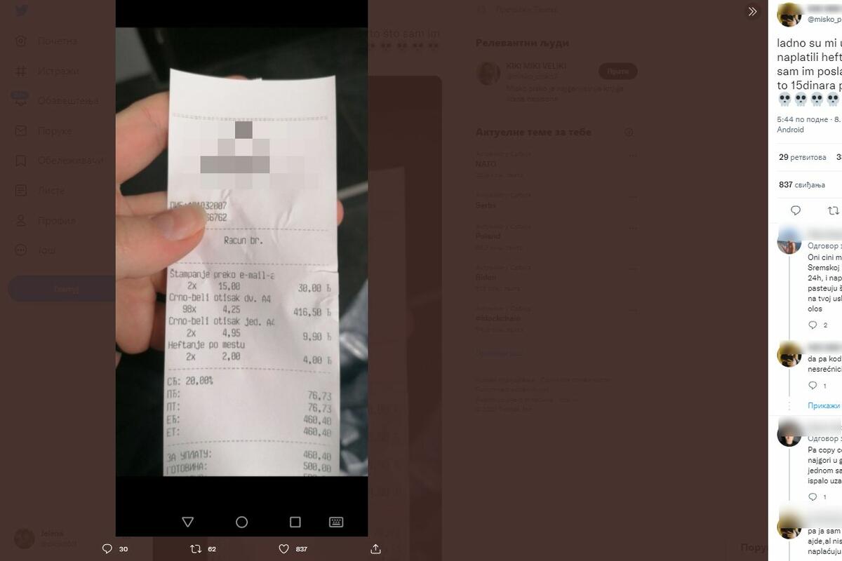 Tako je jedan korisnik društvene mreže Tviter doživeo veliku neprijatnost kada je u kopirnici na Vračaru dobio račun od 460 dinara, a na njemu i stavku "heftanje", koje po rupi, odnosno, mestu iznosi dva dinara!