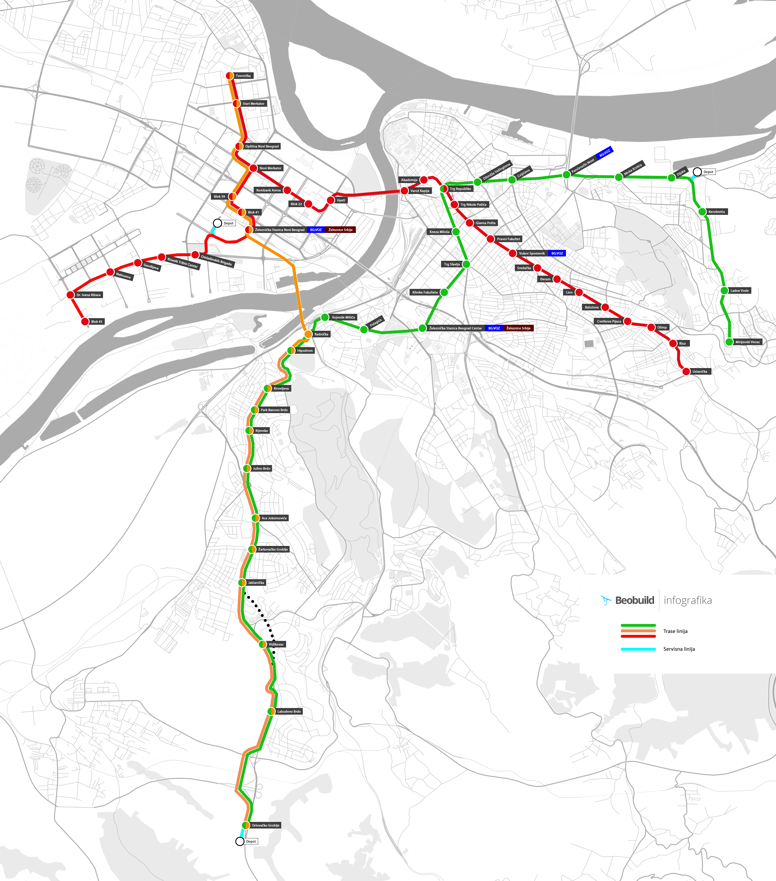 Dugoročno studija predviđa još dve linije i to: Petlovo Brdo - Slavija - Karaburma - Mirjevo i Petlovo Brdo - Tvornička (preko novog mosta), preneo je portal Beobuild.