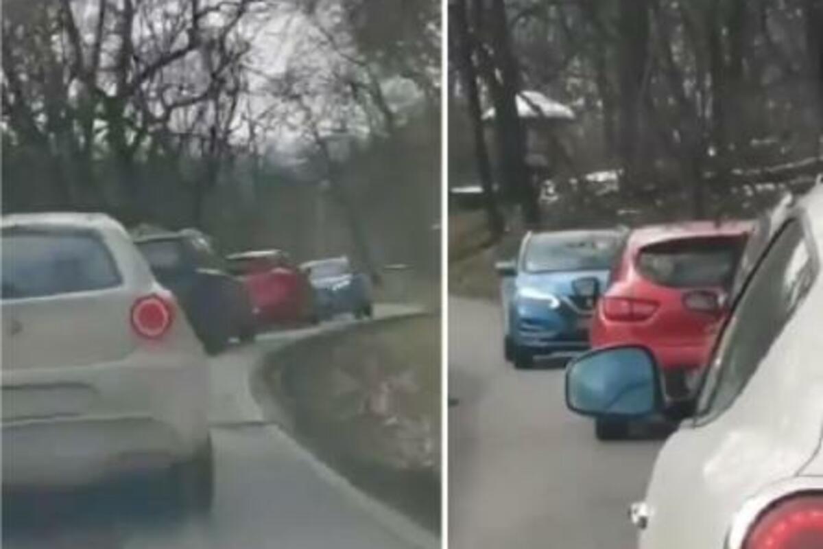 Naime, na video snimku se vidi kako nekoliko automobila vozi polako u koloni zbog toga što vozač automobila “nissan” vozi u rikverc na Košutnjaku, gde je inače put uzak i pun krivina.