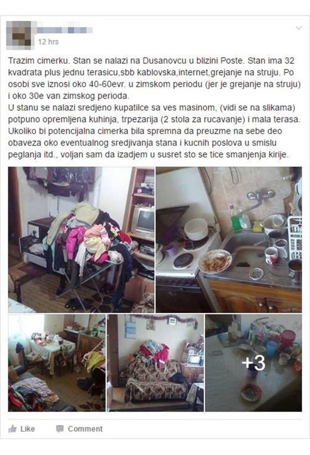 On traži cimerku za stan na Dušanovcu, ali nakon fotografija koje je postavio - ne verujemo da će je naći! Jedan student je oglasio da traži nekog s kim bi podelio troškove u stanu nedaleko od pošte, a iako su troškovi kirije niski, mogli bi biti još niži - kaže on. Uslov: ako cimerka malo posrpemi po stanu!
