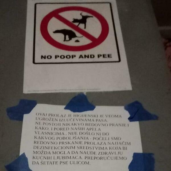 Naime, na oglasu koji je postavio neko od stanara zgrade, navodi se da je zbog neodgovornih vlasnika koji ne skupljaju izmet svojih ljubimca počelo prskanje jakim dezinfekcionim sredstvom "koje bi možda moglo da naudi zdravlju kućnih ljubimaca".