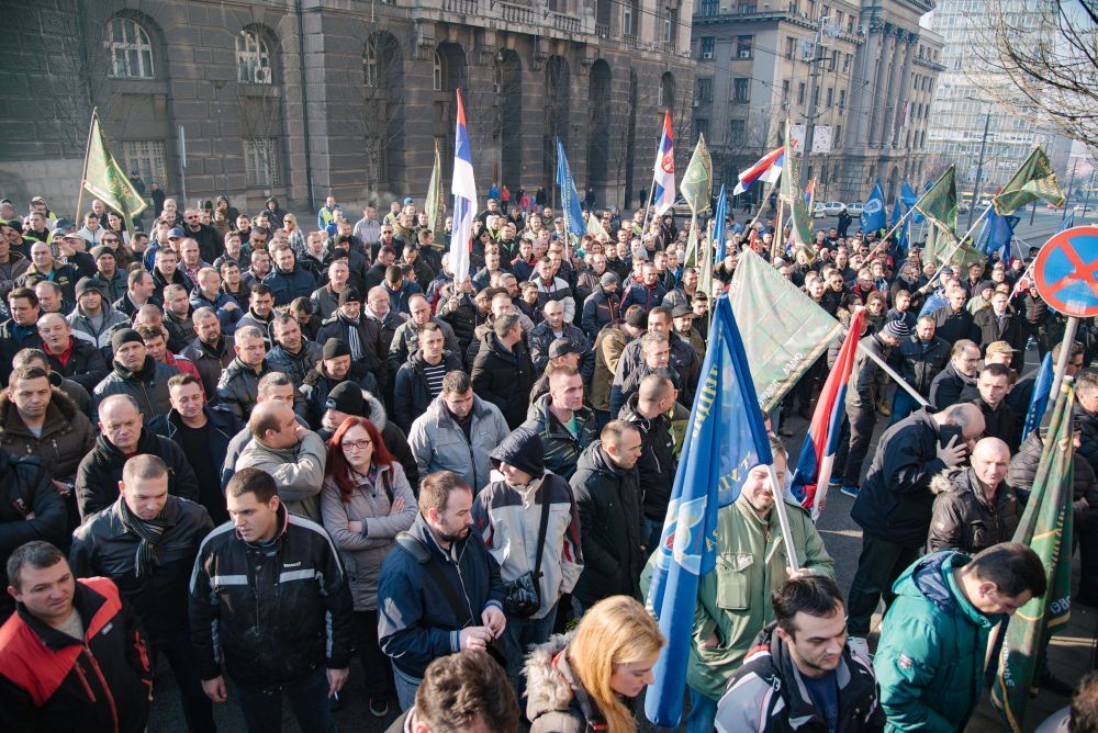 Policijski i vojni sindakt Srbije su protestovali zbog teškog socijalnog stanja zaposlenih u vojsci i policiji, a protest je počeo simbolično u "minut do 12" pevanjem himne Srbije - Bože pravde.