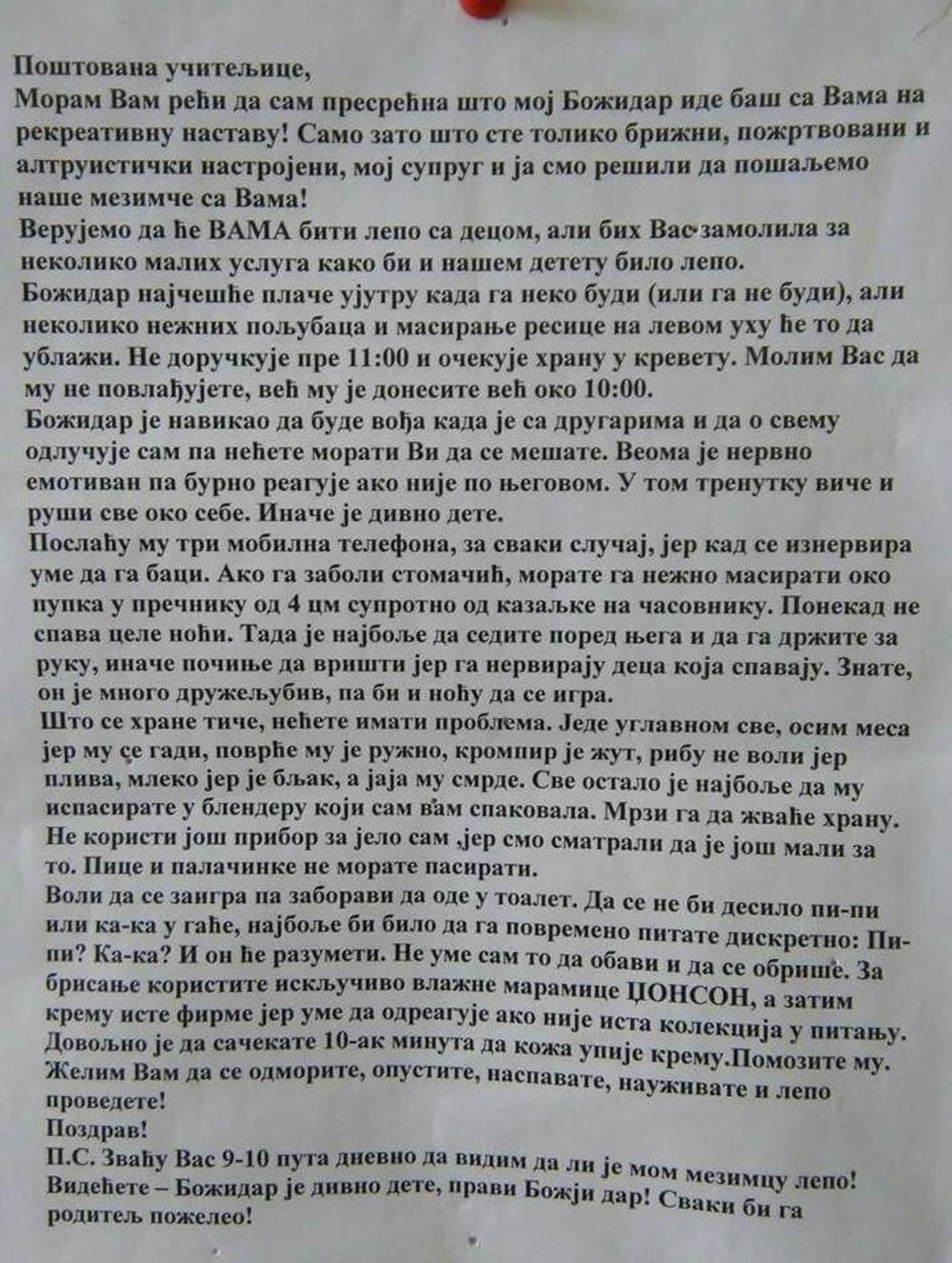 Kad šaljete dete na ekskurziju, logično je da imate brige! I uputstva! Ali verujemo da ovako nešto niste videli. Naime, internetom kruži pismo koje je jedna majka uputila učiteljici koja je njenog sina vodila na putovanje.
