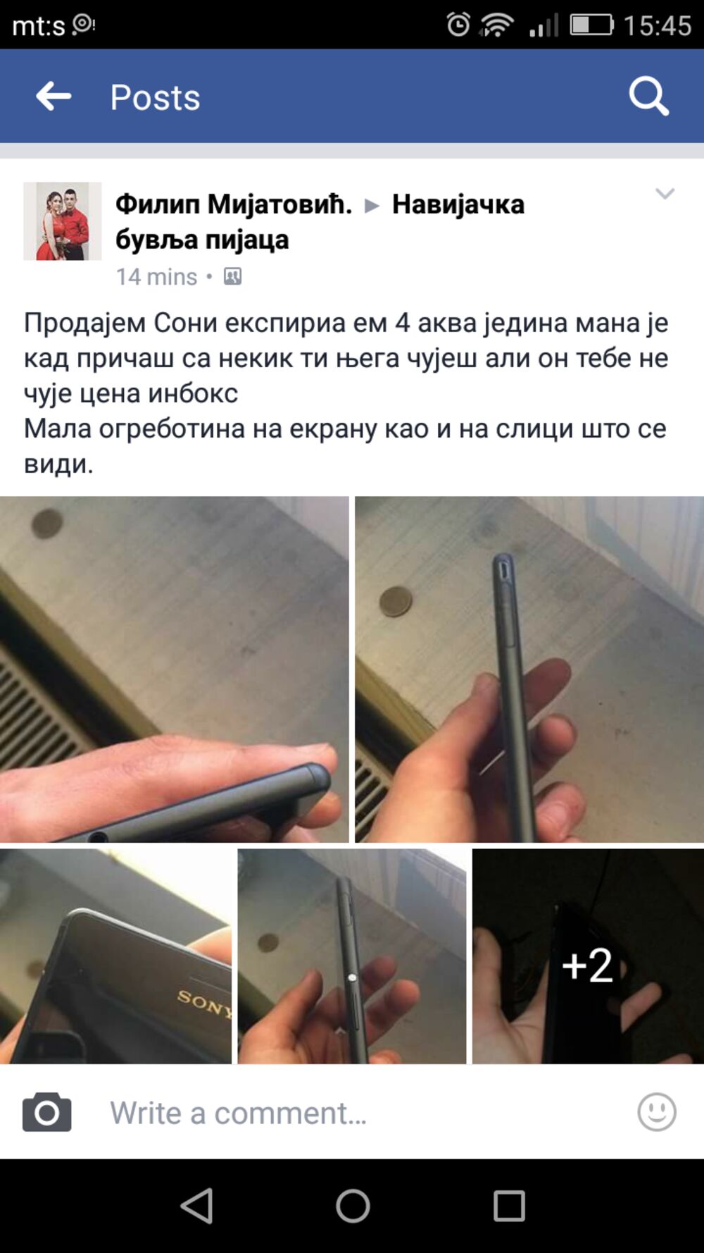 - Prodajem Soni ekspiria em 4 akva. Jedina mana je kad pričaš sa nekim, ti njega čuješ, on tebe ne čuje. Cena u inboks. Mala ogrebotina na ekranu, kao na slici što se vidi - napisao je Mijatović.