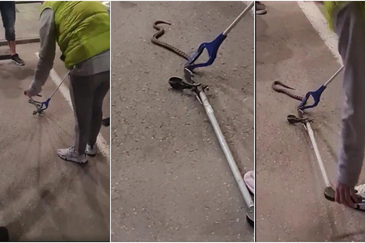 - Kad smo mi stigli zmija se, verovatno zbog straha, sakrila ispod rezervoara jednog od automobila koji su bili na parkingu. Upotrebili smo specijalne hvataljke kojima smo je izvukli i stavili u džak. Životinja je nakon toga puštena u prirodno stanište gde nikoga neće ugrožavati - objašnjava Stojanović.