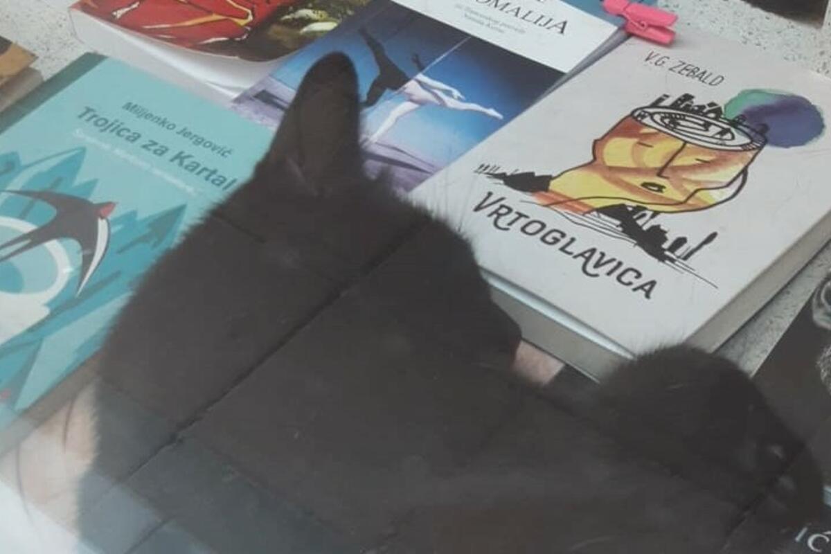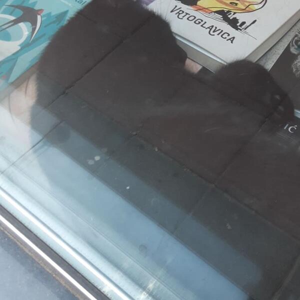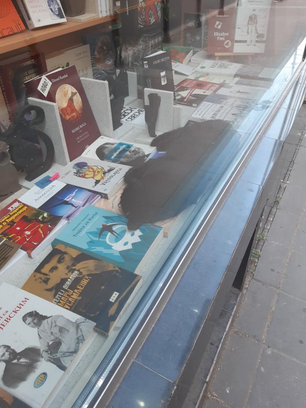 Crna maca se naslonila na staklo izloga u knjižari i zadremala