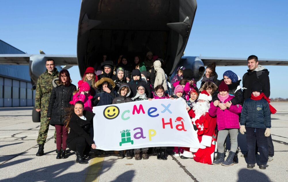 Usledilo je upoznavanje dece sa Deda Mrazom koji je za prvi susret spremio slatkiše, a zatim su najmlađi posetioci aerodroma imali prilike da uđu u avion i da se druže sa posadom vazduhoplova koji im je dovezao omiljenog junaka. U vojničkom restoranu 204. vazduhoplovne brigade upriličena je i podela novogodišnjih paketića prve studentske humanitarne fondacije "Osmeh na dar". U prikupljanju slatkiša, igračaka i školskog pribora za svoje vršnjake učestvovala su i deca sportisti iz sportskog udruženja "Sveta Srbija" iz Beograda koji su uz pripadnike 204. vazduhoplovne brigade Vojske Srbije bili domaćini svojim vršnjacima iz navedenih institucija za decu i omladinu. Akciju, koja se sprovodi petu godinu za redom, podržali su i pripadnici Klinike za anesteziologiju i intenzivnu terapiju VMA.