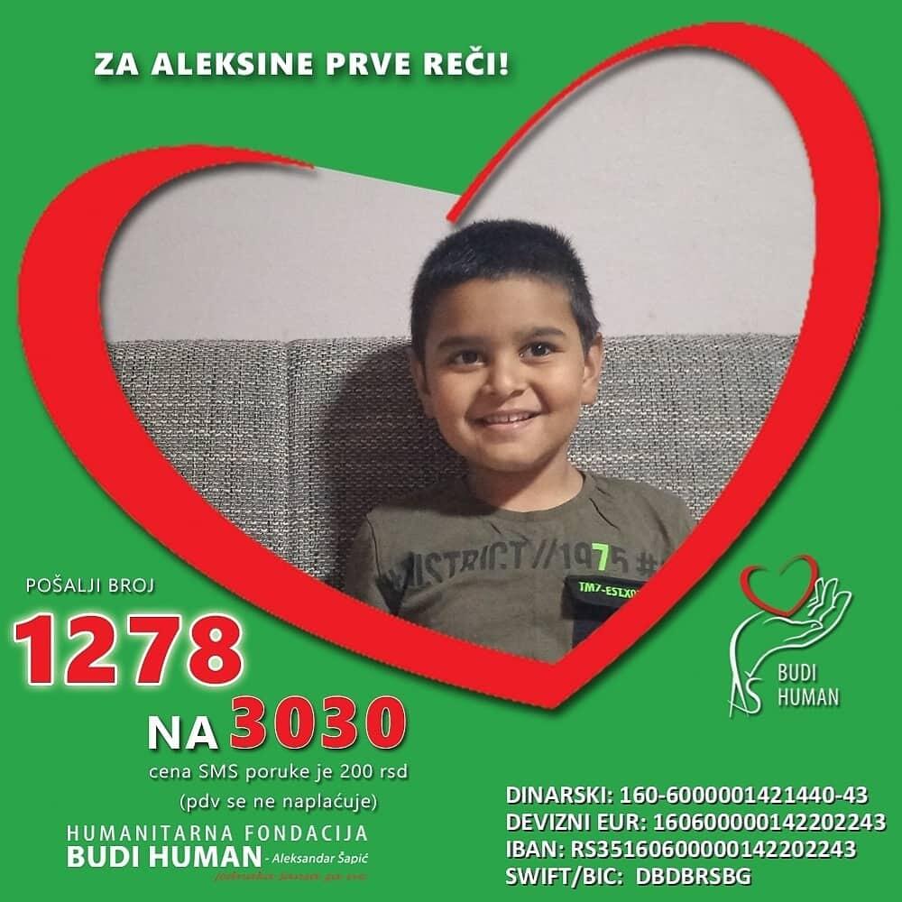 Aleksa ne govori i poseduje elemente autizma. Redovno posećuje logopeda i defektologa.
