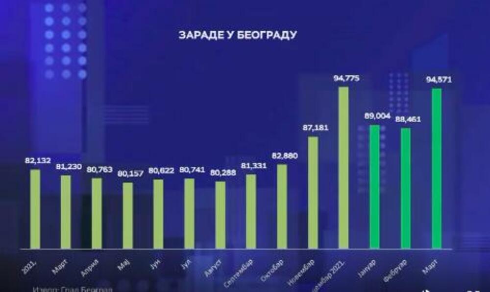 Prema podacima Zavoda za statistiku, prosečna neto zarada u Beogradu u martu iznosila je 94.571 dinar. U odnosu na isti mesec prethodne godine veća je za osam odsto realno.
