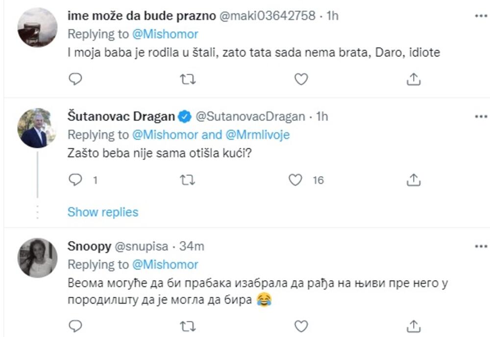 Roditi dete nije bolest koja se mora tretirati, nego normalan prirodan događaj. Moja prabaka je rodila moju baku na njivi u kukuruzima i poslala je moju baka tetku s bebom kućí, a ona je nastavila da radi dalje. Današnje žene se bune kada dobiju pažnju da im nije dovljno ili da im je previše. Ako je sve u redu i nema problema, ni nema potrebe da žene sede u porodilištima ili da budu izložene nepotrebnim pregledima", stoji u Tvitu koji je naišao na burne reakcije korisnika.
