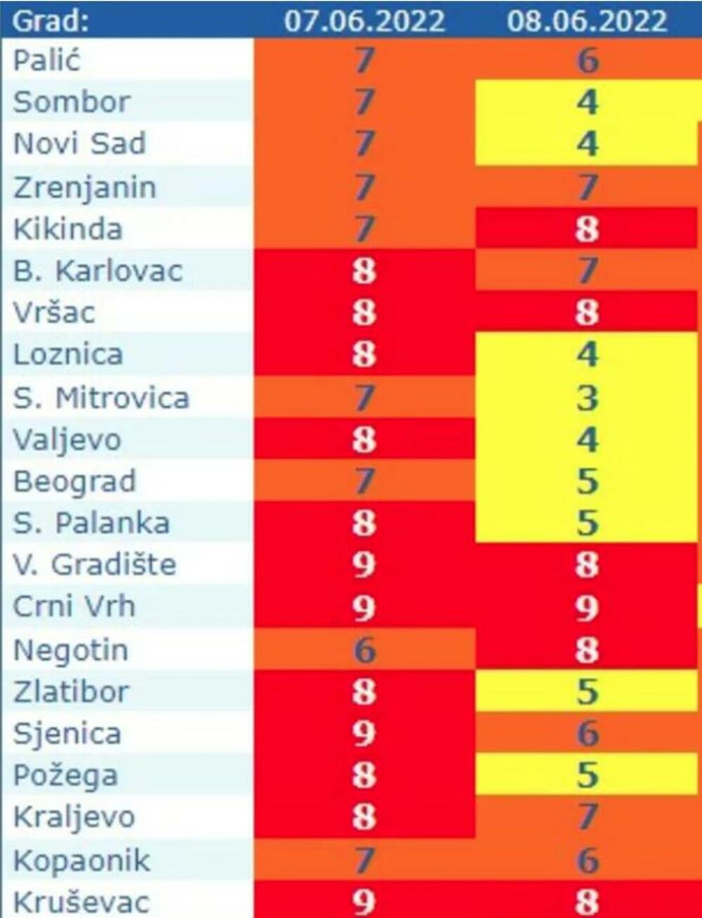 Kada je reč o UV indeksu, u većini mesta u Srbiji je u kategoriji veoma opasna pojava i označen je brojevima osam i devet i crvenom bojom. Najniži UV indeks danas je u Negotinu i označen je brojem 6.