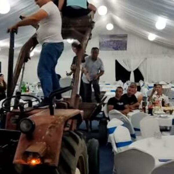 Tako su na ovom slavlju pod šator prvo "uterali" stara zaprežna kola na koja su popeli pevačicu, a onda je sve to začinio domaćin sa svojim drugarima pa je pod šator ušao traktorom na koji je bila nakačena kašika, a u njoj nekoliko momaka.