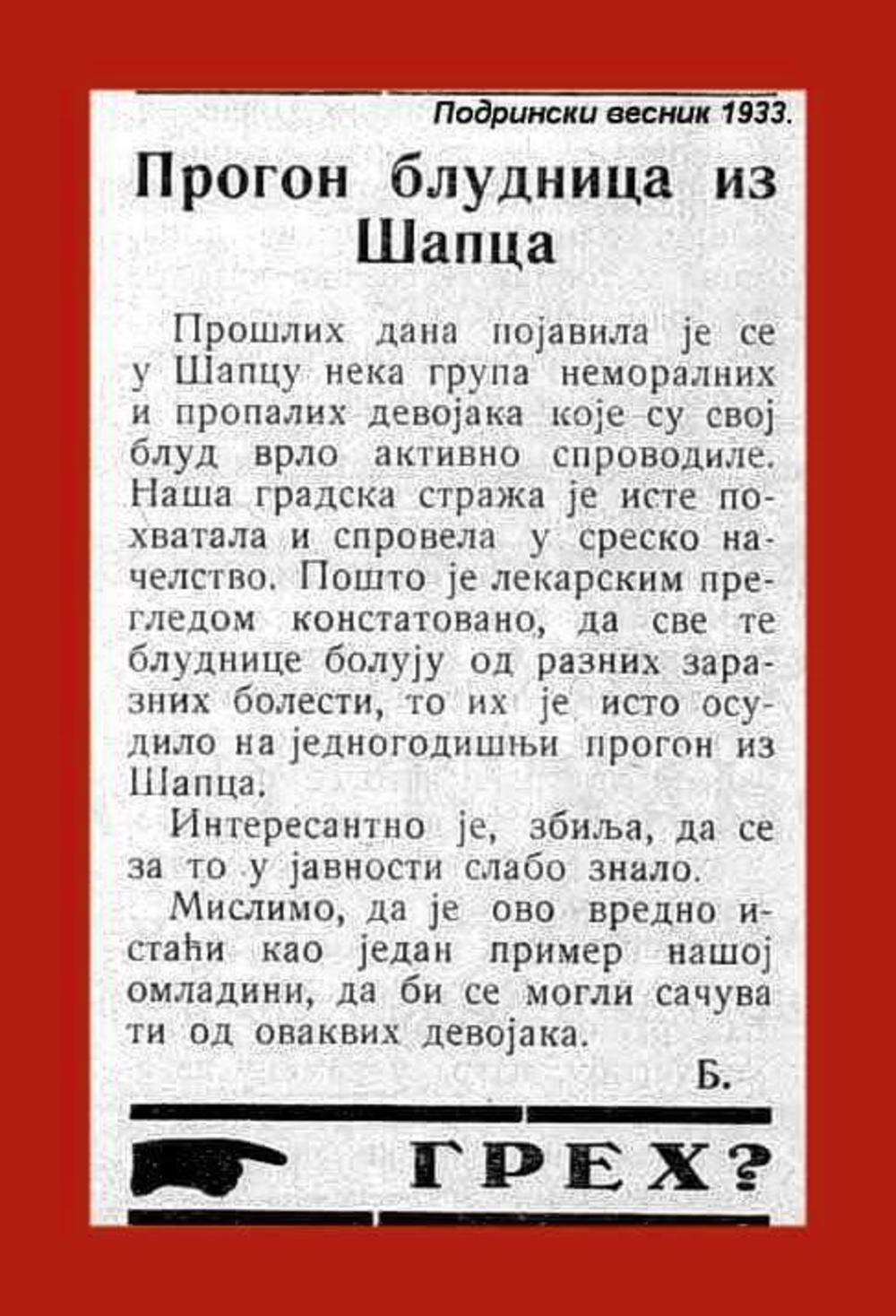 "Prošlih dana pojavila je se u Šapcu neka grupa nemoralnih i propalih devojaka koje su svoj blud vrlo aktivno sprovodile. Naša gradska straža je iste pohvatala i sprovela u sresko načelstvo. Pošto je lekarskim pregledom konstatovano, da sve te bludnice boluju od raznih zaraznih bolesti, to ih je isto osudilo na jednogodišnji progon iz Šapca.