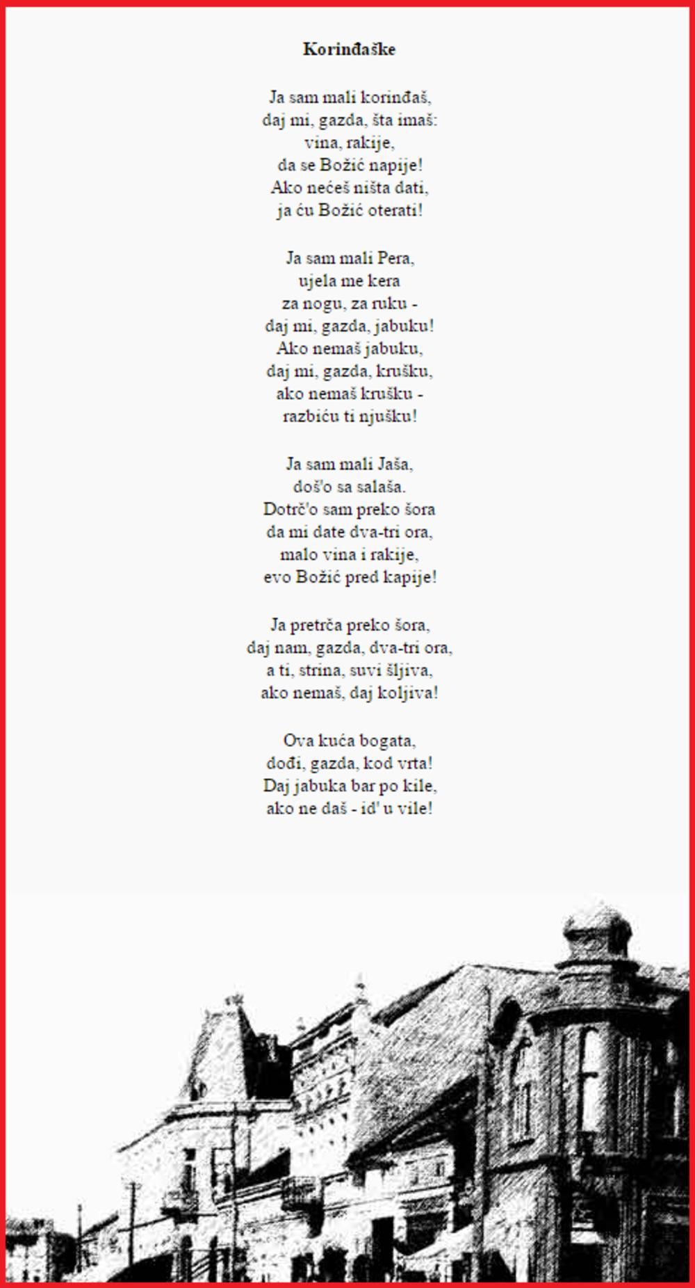 Ritual počinje kada im domaćin otvori, deca najpre pitaju: "Je l' primate korinđaše?" ili "Da li je slobodno korinđati?" Tada počinju da pevaju pesmicu, i to uglavnom ovu: