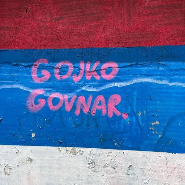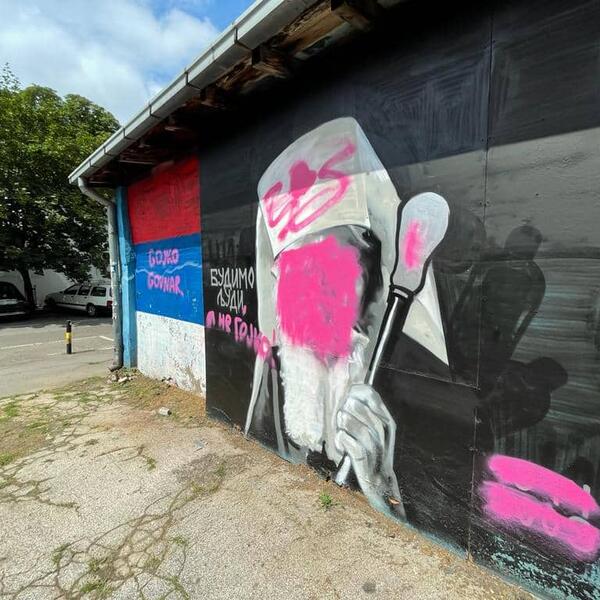 Kako se može videti na fotografijama, od jutros lice patrijarha prekriveno je farbom roze boje, a ispod natpisa "budimo ljudi", stoji "a ne Gojko".
