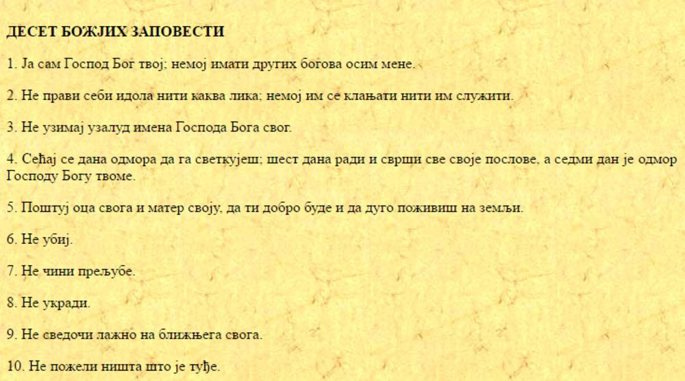 Zakleo se da će služiti Bogu. Volela bih ja, antihrist od deteta, nekršteno dete, da upoznam tog "mučenika". Da mu pod nos natrljam Božje zapovesti koje ni ja, koja nisam vernik, nikad nisam prekršila. Posebno bih se zadržala na osmoj.