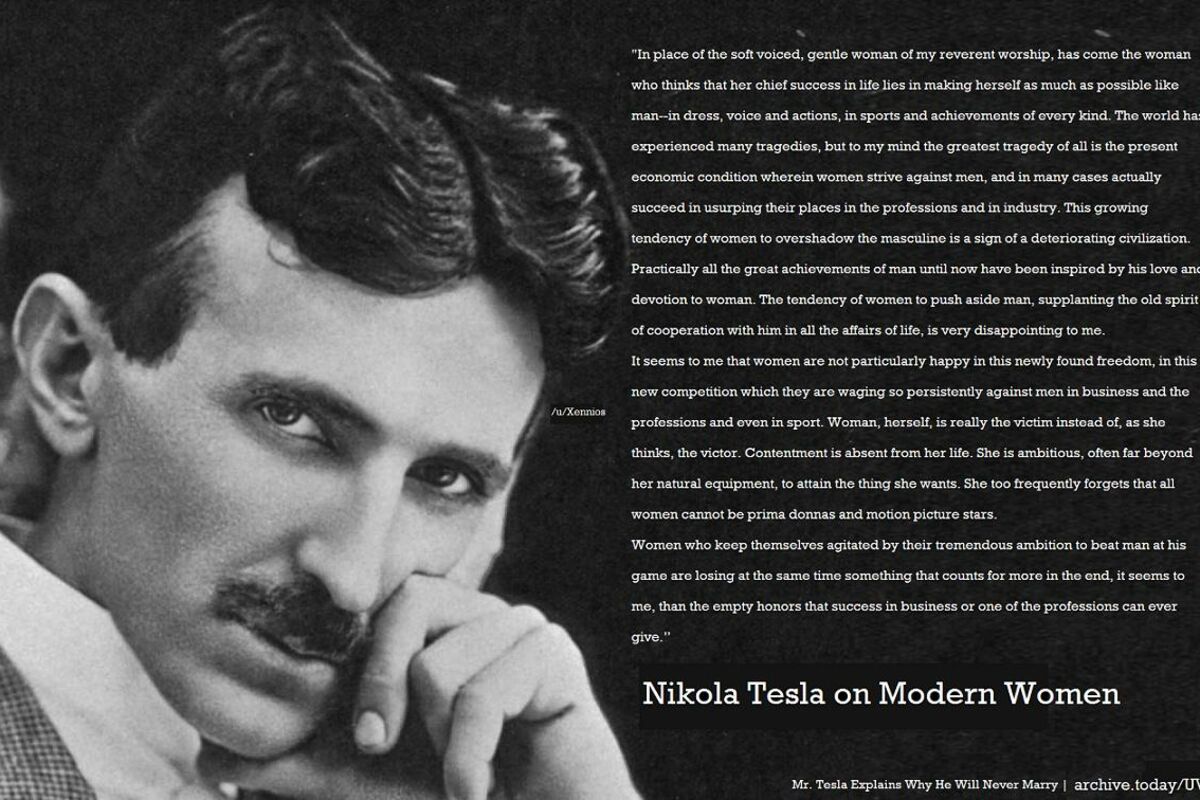 „Žene postaju jače od muškaraca, i fizički i mentalno. Svet je iskusio mnoge tragedije, ali po mom mišljenju, najveća tragedija od svih jeste trenutna ekonomska situacija u kojoj su žene protiv muškaraca, i u mnogim slučajevima uspevaju da uzurpiraju njihova mesta u profesijama i industriji. Ova rastuća tendencija žena da zasene muškost znak je civilizacije u propadanju” – tvrdio je Tesla 1924. godine.