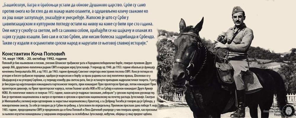 - Bašibozluk, bagra i brabonjci ustali da obnove Dušanovo carstvo. Srbi su samo protiv onoga ko bi hteo da ih makar malo opameti, a oduševljeno kliču svakome ko ih još više zaglupljuje, unazađuje i unesrećuje. Žalosno je što su Srbi u civilizacijskom i kulturnom pogledu ostali na nivou na kome su bili pre sto godina. Oni nisu u sukobu sa svetom, već sa samima sobom, vraćajući se na šajkaču i opanak iz kojih su jedva izašli. Bio sam i ostao Srbin, ali nisam bolesna zadribanda i Srbenda. Takvi su izdali i osramotili srpski narod i narugali se njegovoj slavnoj istoriji - napisao je Koča Popović.