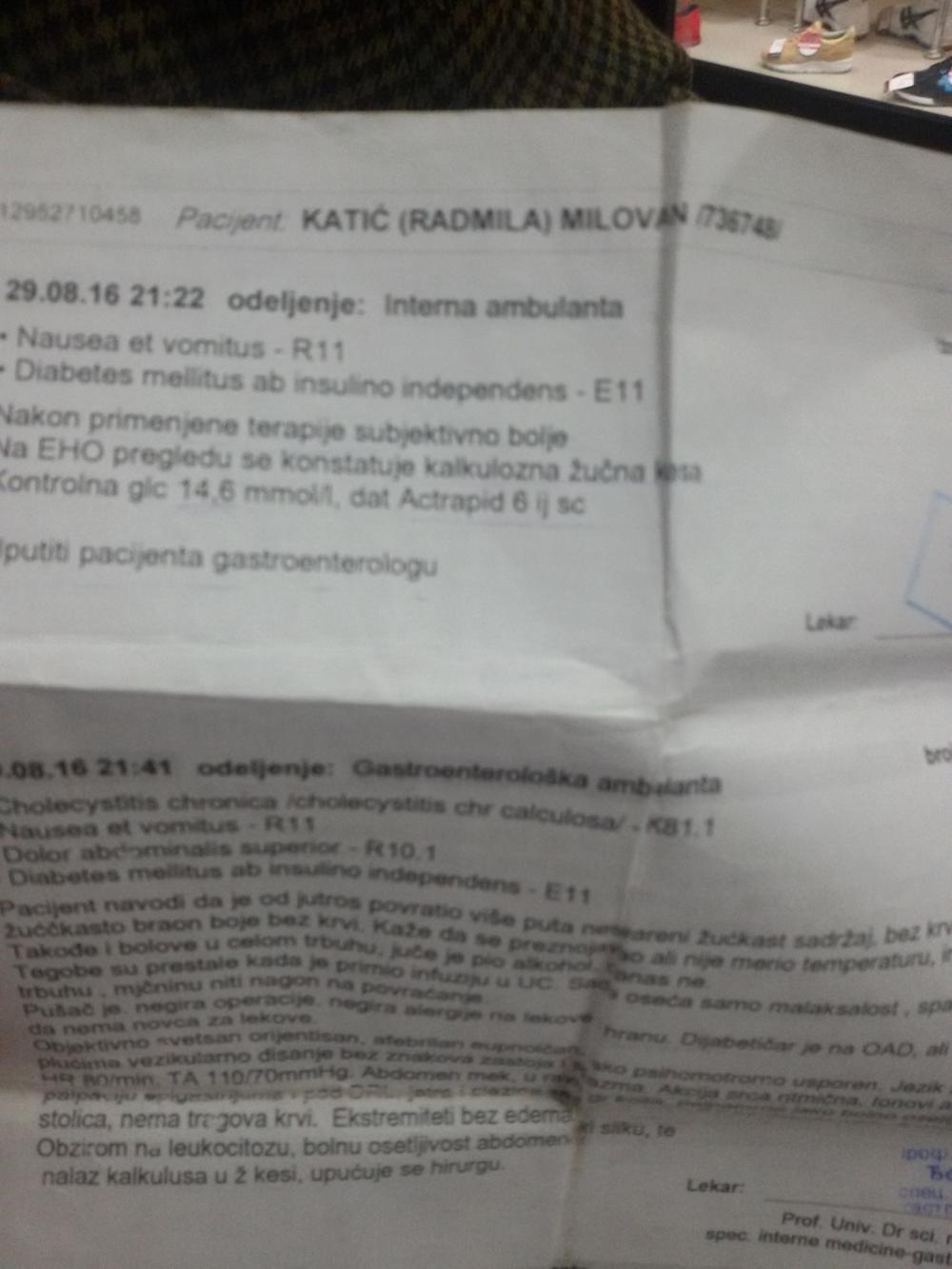 U njemu jasno piše da Milovan ima kalkuloznu žučnu kesu i da je šećeraš. U izveštaju piše da mu treba hitno hiruško lečenje.