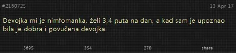 Tviteraši su poznati po tome da su najžešći kada "opletu" po nekome, ali i na sajtu "Ispovesti" ima šta i da se vidi. Tako se jedan mladić požalio na svoju devojku i napisao: "Devojka mi je nimfomanka, želi 3,4 puta na dan, a kad sam je upoznao bila je dobra i povučena devojka", naveo je on i napravio pravi haos na internetu.