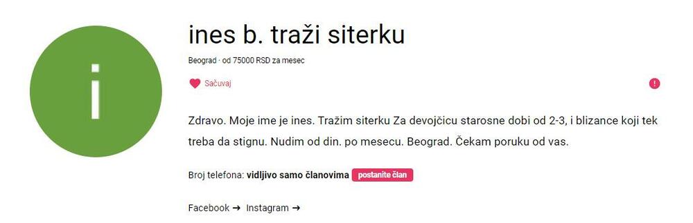 Bilo je i mizernih ponuda, pa smo tako pronašli oglas gde porodica u Novom Sadu nudi 29.400 dinara za posao čuvanja petomesečne bebe za koju je potrebno neprestano angažovanje, i to radnim danima.