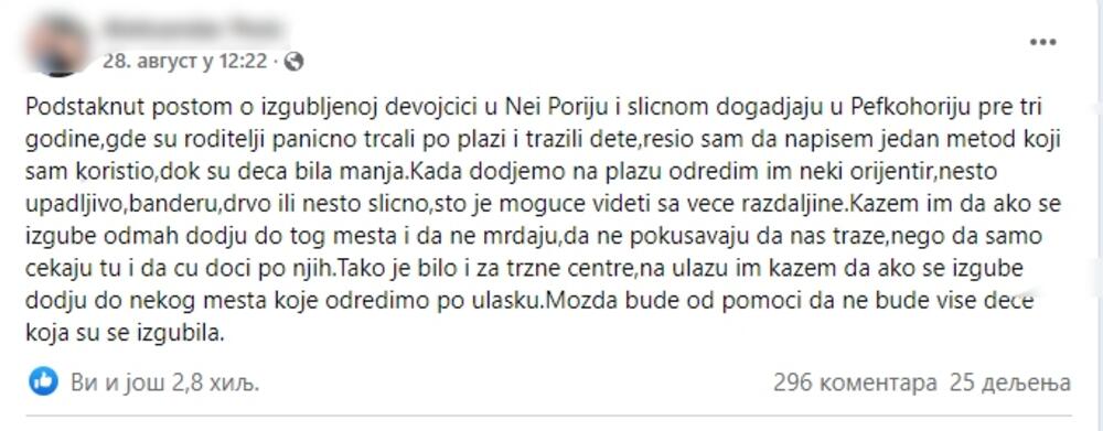 "Podstaknut postom o izgubljenoj devojcici u Nei Poriju i slicnom dogadjaju u Pefkohoriju pre tri godine,gde su roditelji panicno trcali po plazi i trazili dete,resio sam da napisem jedan metod koji sam koristio,dok su deca bila manja.Kada dodjemo na plazu odredim im neki orijentir,nesto upadljivo,banderu,drvo ili nesto slicno,sto je moguce videti sa vece razdaljine.Kazem im da ako se izgube odmah dodju do tog mesta i da ne mrdaju,da ne pokusavaju da nas traze,nego da samo cekaju tu i da cu doci po njih.Tako je bilo i za trzne centre,na ulazu im kazem da ako se izgube dodju do nekog mesta koje odredimo po ulasku.Mozda bude od pomoci da ne bude vise dece koja su se izgubila", napisao je, a lajkovi su samo pljuštali.